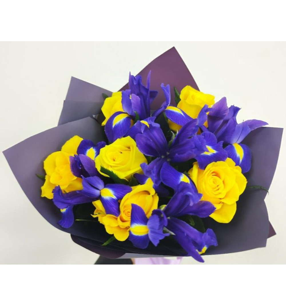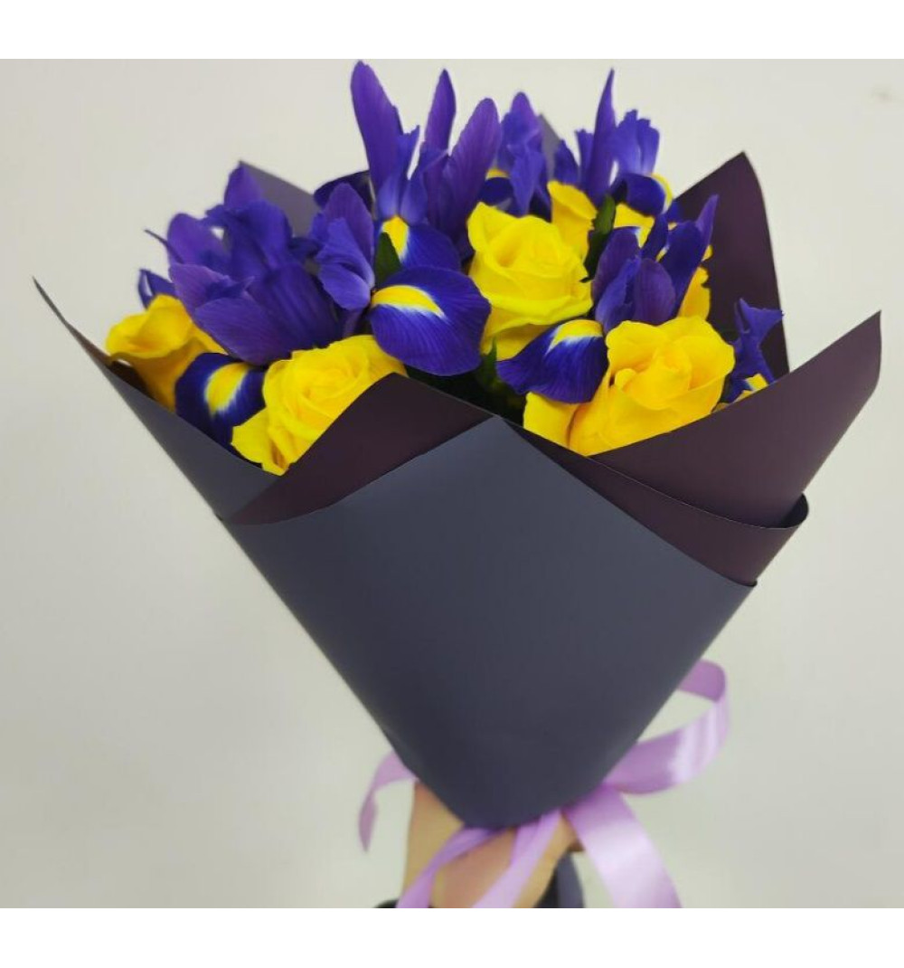 Букет состоит из красивых ирисов и ярких желтых роз, создавая свежий и яркий образ. Эти цветы подойдут для любого случая, от дня рождения до даты свадьбы или просто для того, чтобы поднять настроение